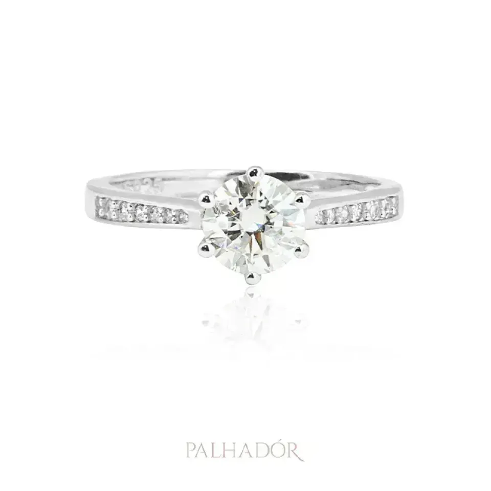 A moissanite é uma gema deslumbrante conhecida por sua beleza e brilho excepcionais oferecendo uma alternativa impressionante aos diamantes. A extraordinária dispersão de luz das pedras de Moissanite criam um jogo de cores intensas e brilhantes quando exposta à luz. Trabalhado em prata 925 de altíssima qualidade, o anel vem acompanhado de um Certificado Global Gemologico para certificar a pureza da pedra, garantindo a comprovação que estará adquirindo uma joia genuína e de altíssimo padrão.