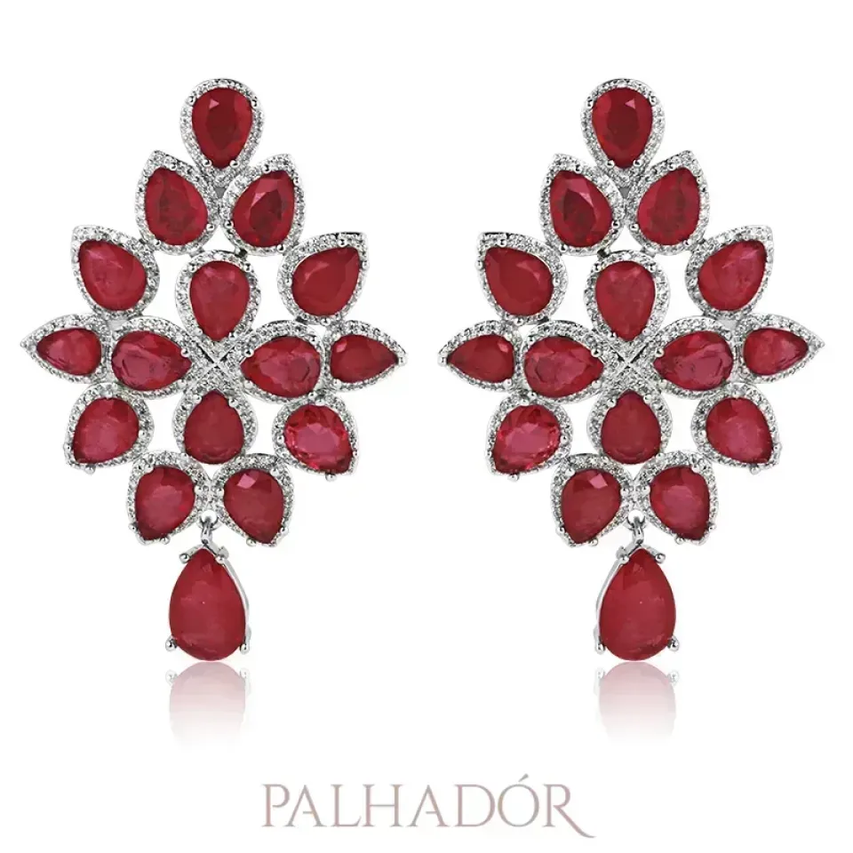 BRINCO CRAVEJADO LUXO GOTAS RUBI RÓDIO BRANCO