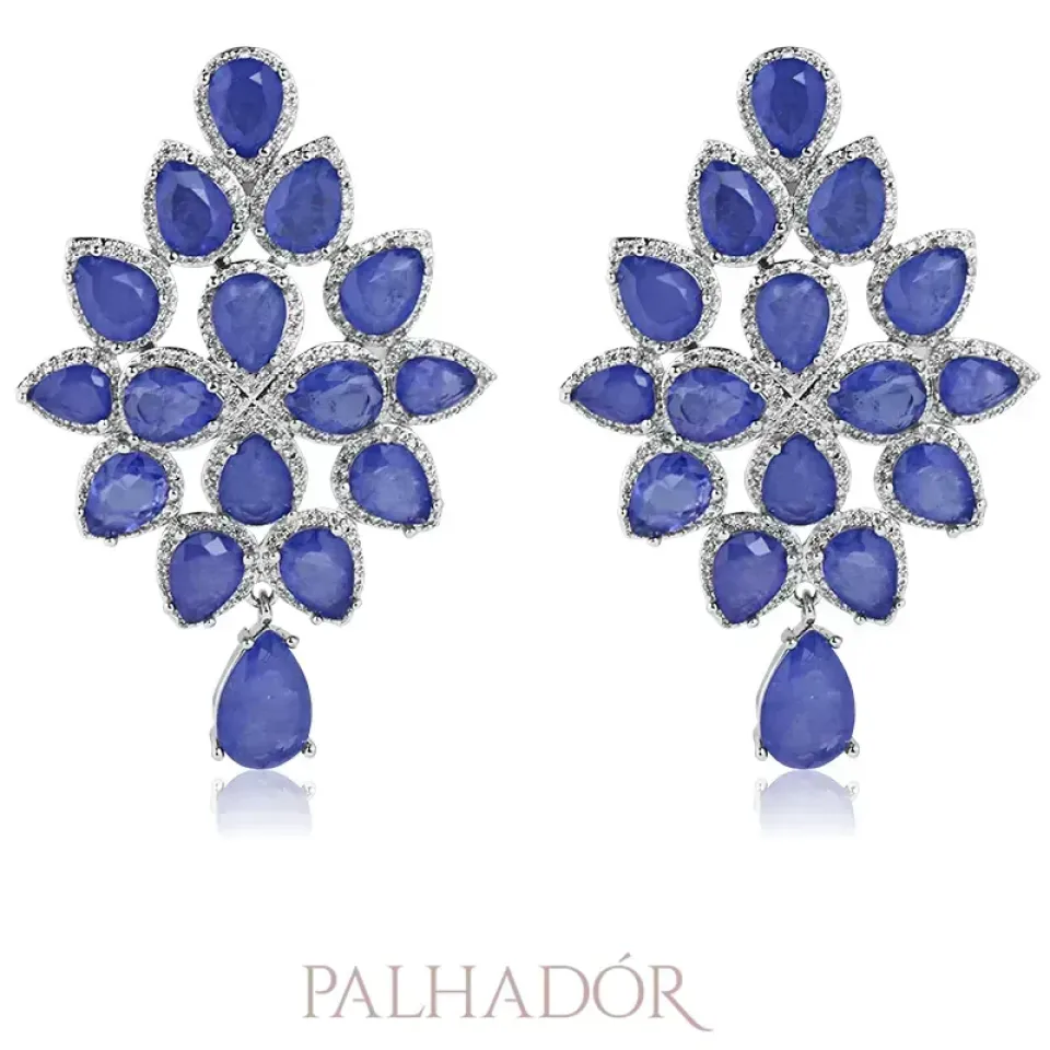 BRINCO CRAVEJADO LUXO GOTAS SAFIRA RÓDIO BRANCO