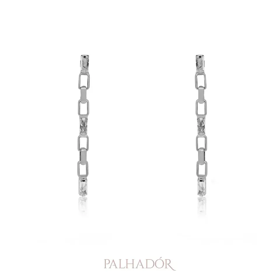 O destaque deste brinco são os elos baguete cravejados de cristais, que adicionam um toque de glamour e sofisticação. Os cristais, dispostos de forma harmônica, captam a luz e refletem brilho em diversos ângulos, tornando o brinco uma verdadeira joia deslumbrante. O design de elos é uma escolha contemporânea e versátil, permitindo que o brinco seja usada tanto em ocasiões formais quanto em eventos mais descontraídos, proporcionando um toque de estilo em qualquer look.