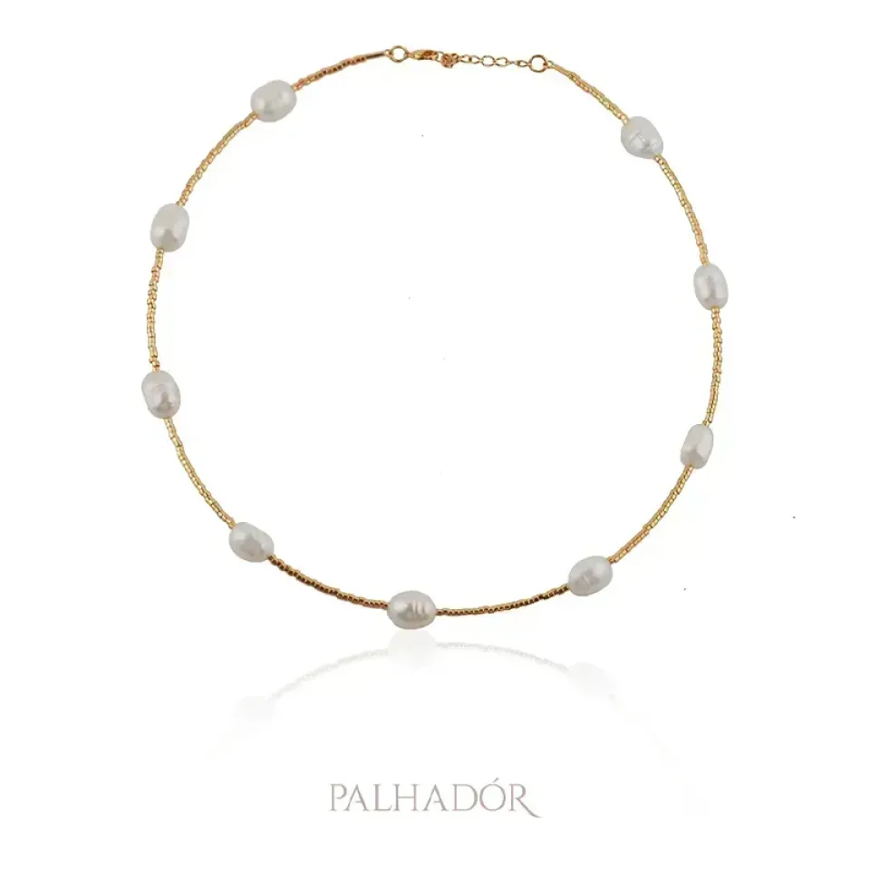 O design do colar é elegante e refinado. As pérolas são espaçadas harmoniosamente por delicadas placas banhadas em ouro 18k sendo uma peça versátil perfeita para complementar uma variedade de looks, desde trajes formais até roupas casuais elegantes. Seu design clássico e atemporal faz dele um acessório que transcende as tendências passageiras, tornando-o essencial em qualquer coleção de joias.
