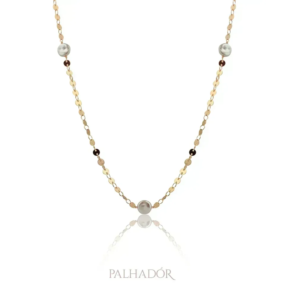 COLAR LONGO MEDALINHA E PÉROLA MOEDA OURO