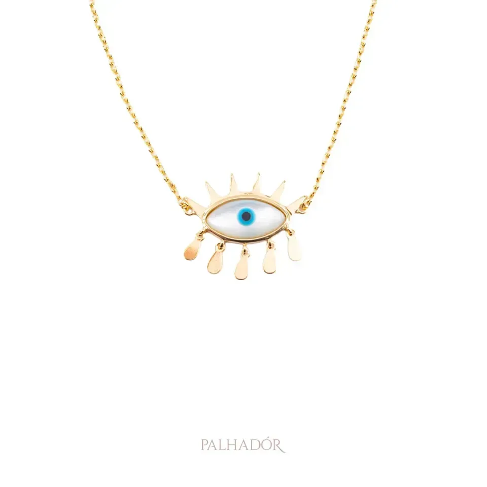 Tornozeleira olho grego e gotinhas banhado em ouro 18k.